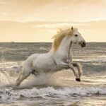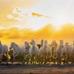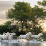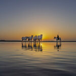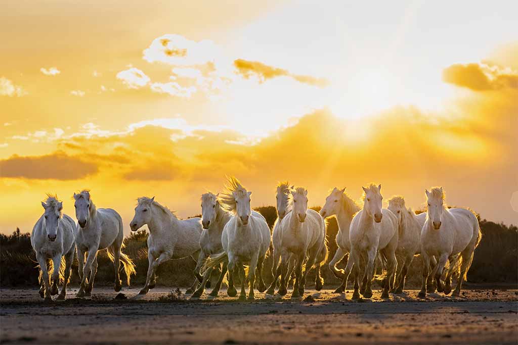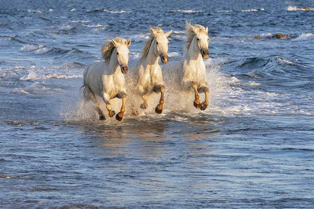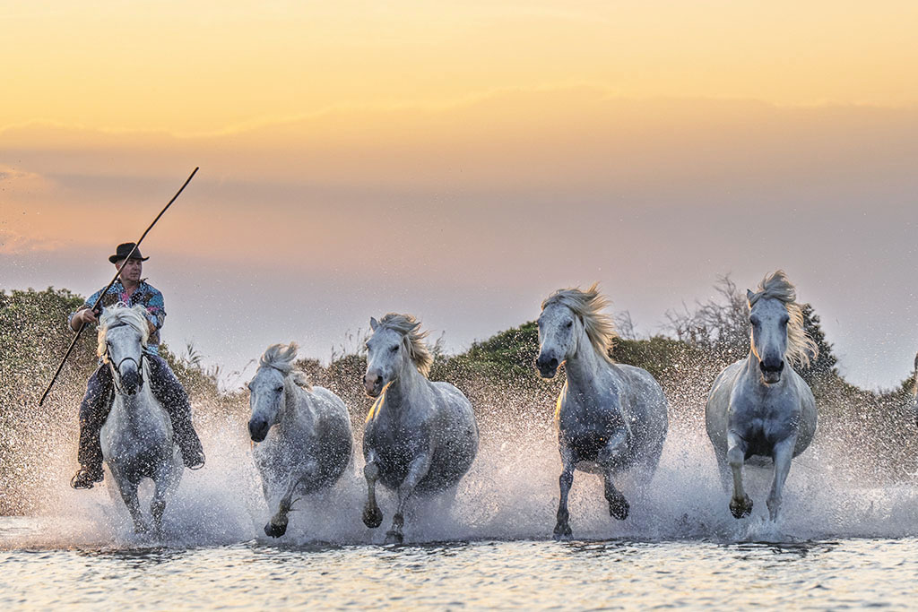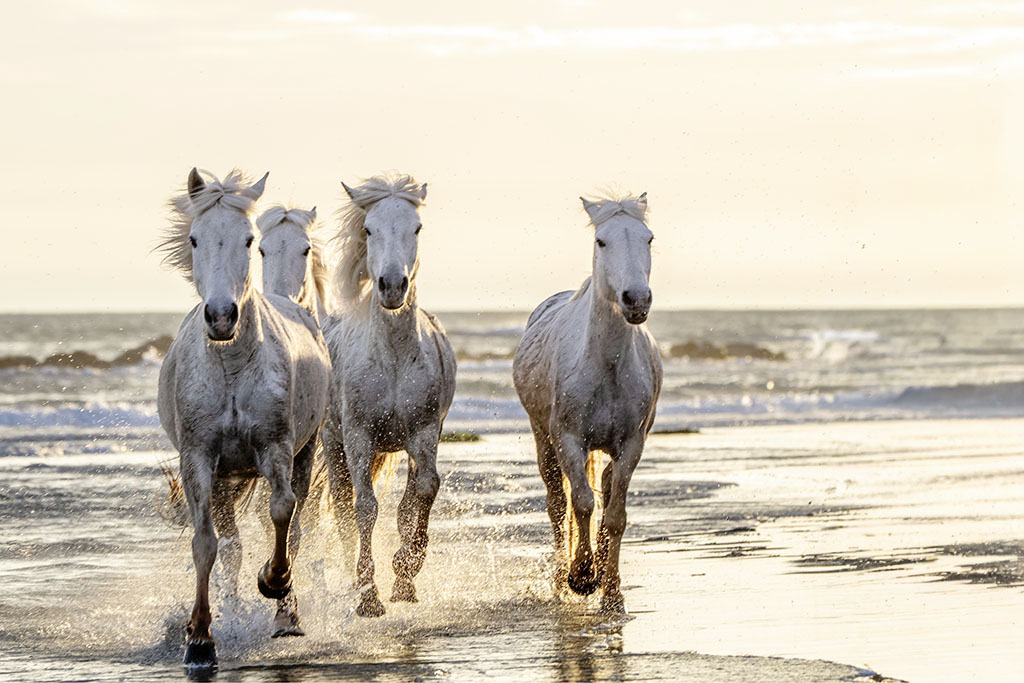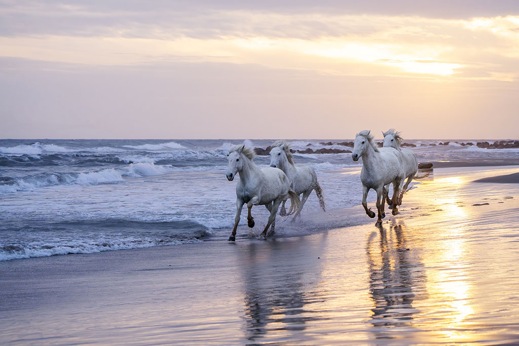 At sunrise, we photograph the Camargue wild white horses at a peaceful lagoon with beautiful reflections. We then head for the beach to capture the horses running along the golden sand and in the sea and surf.