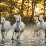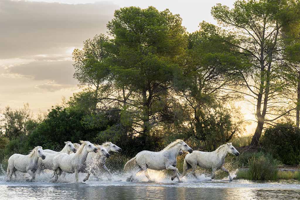 Early morning, we have another session with the Camargue wild white horses in the marsh. We also capture the horses, beautifully backlit, by the sunrise, as they run through the woods. After the action, we take close-up portraits of the horses.