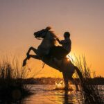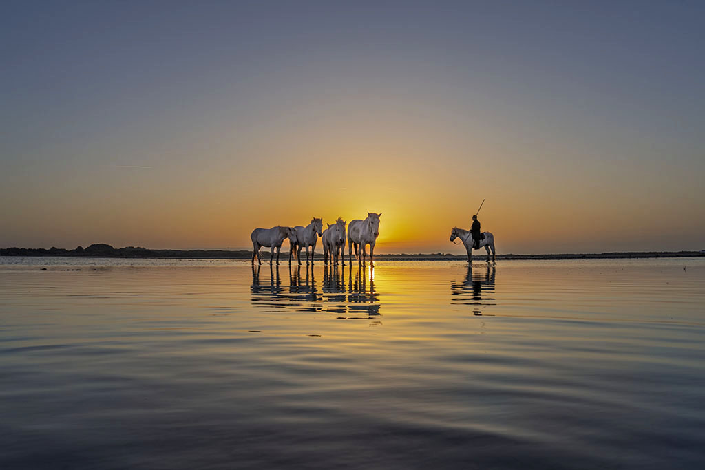 Late afternoon, we photograph the Camargue wild white horses running through the marsh. We shoot several drives with the horses running across and towards your field of view. We will also take portraits of the ‘Gardians’ (Camargue Cowboys) dressed in their traditional Camargue attire, trident in hand, surrounded by the herd.