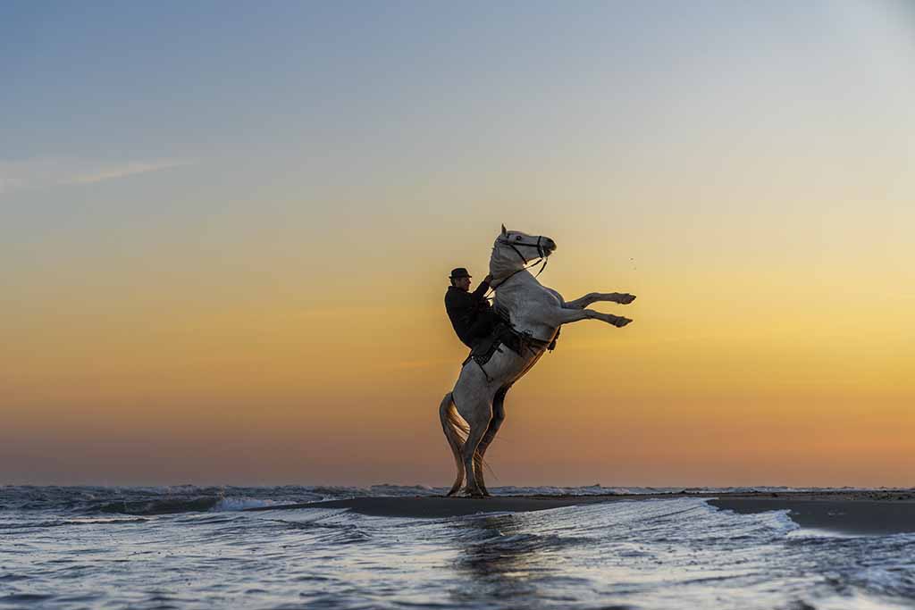 In the afternoon, we photograph the sparring stallions – this is a unique opportunity to see the Camargue white horses entwined at full height, in feisty temperament, with their manes flying.