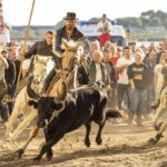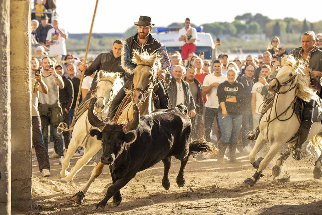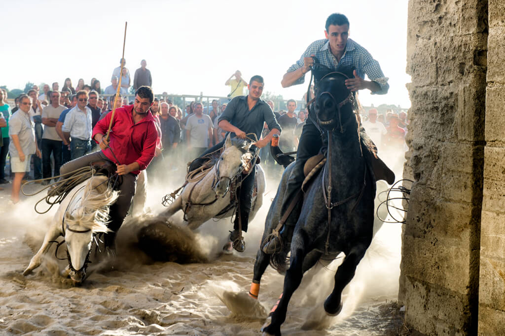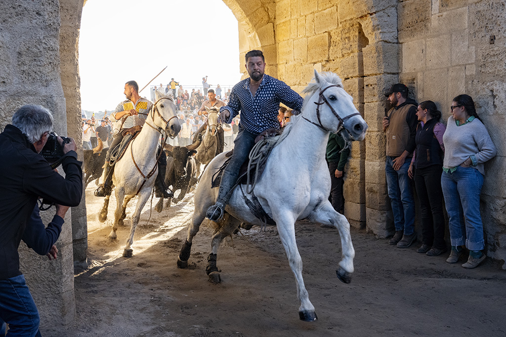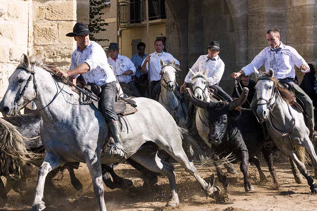 Late afternoon, in Aigues-Mortes, it is time for the Bandido (the departure) – the Gardians flank one bull at a time as they gallop back through the narrow streets of town. The youngsters test their bravery by standing in the way as long as possible, to destabilise the horses and allow the bull to escape! Capture stunning action pictures of the horses and bulls, with the sun setting behind the stone archways of the old city gates.