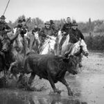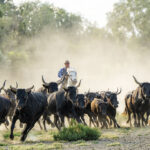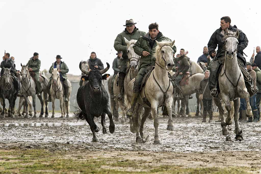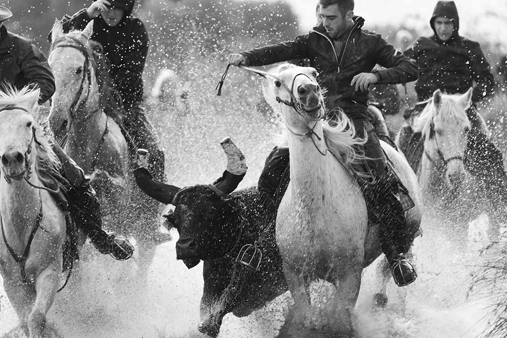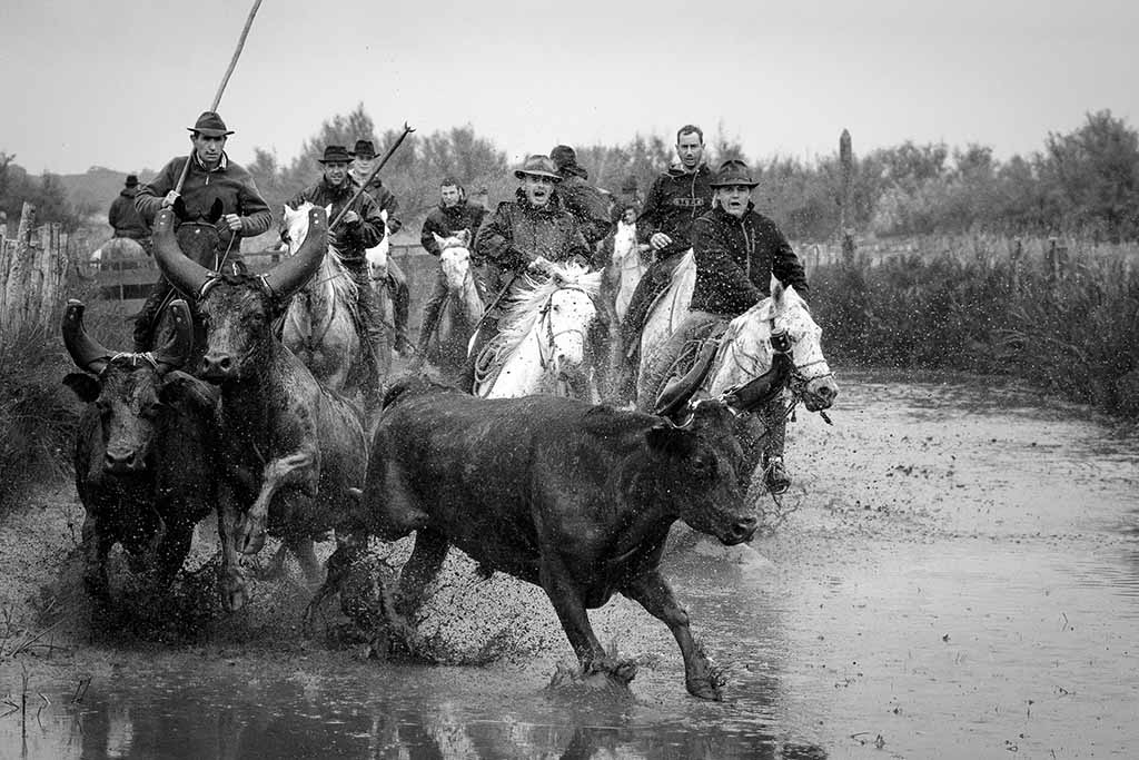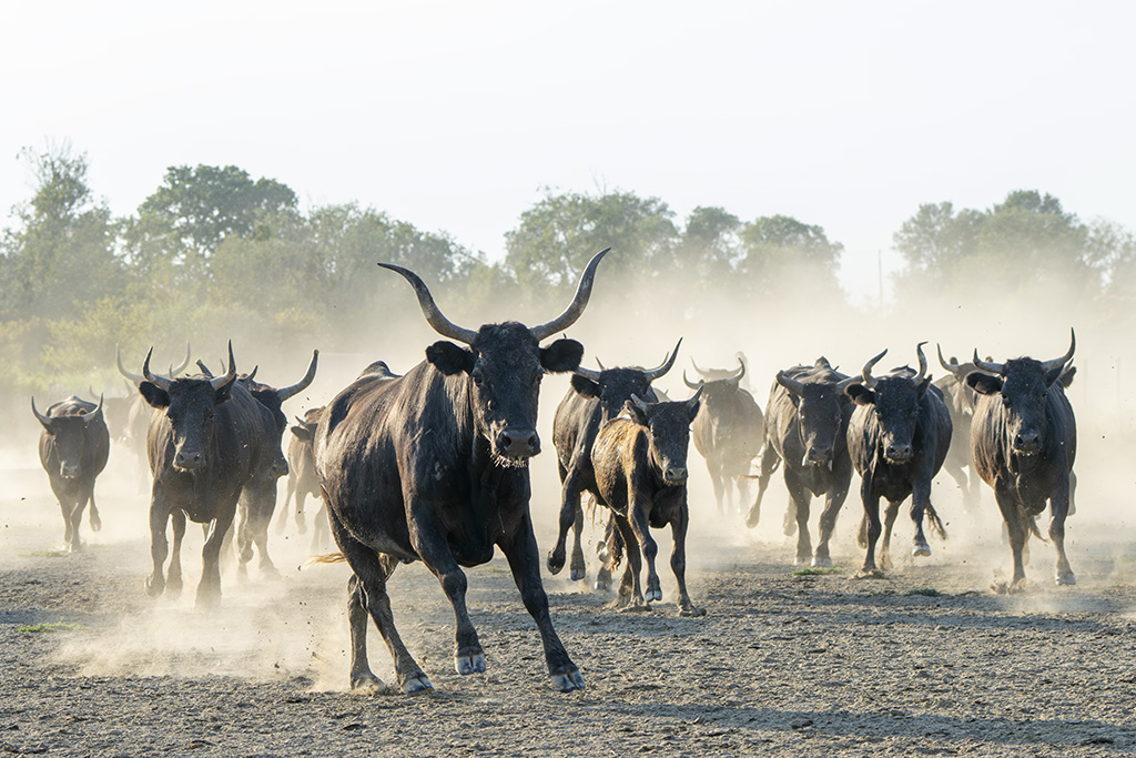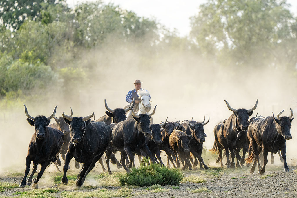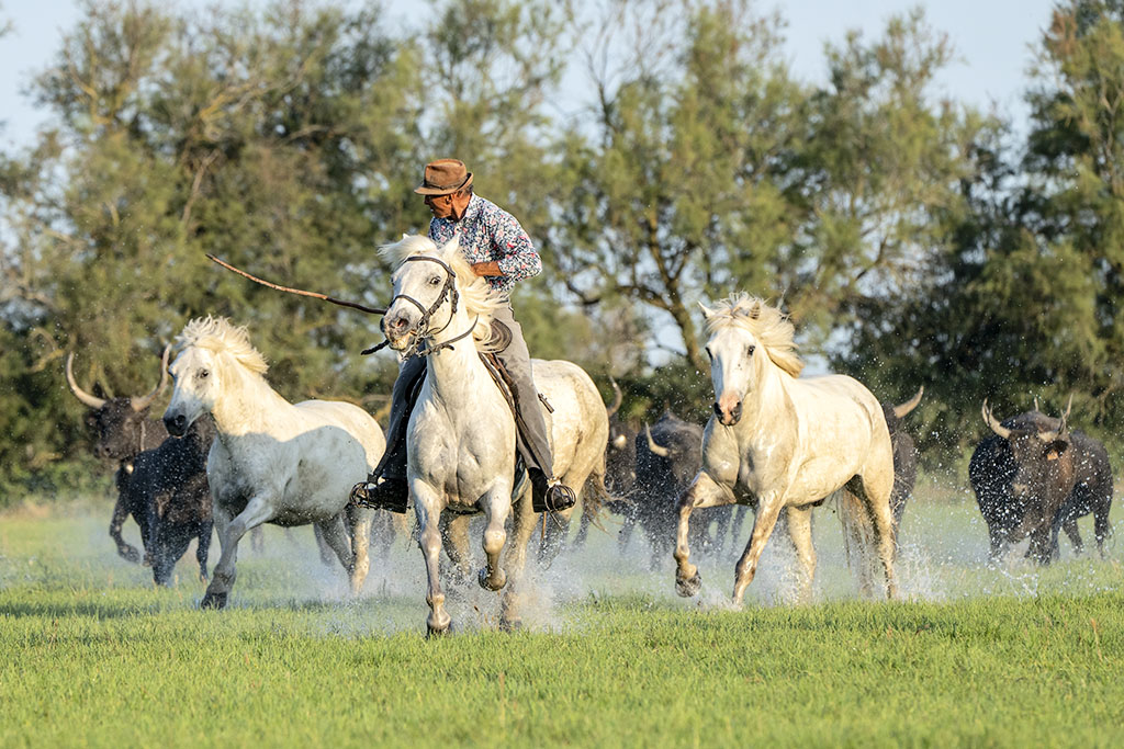 In the afternoon, we photograph the Camargue Black bulls in action thundering their way through the marshy shallow water, their horns held high, herded by the Gardians on horseback – an exhilarating photographic experience!
