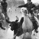 We start with traditional breakfast (‘casse-croûte’) in the meadow with the Gardians and locals, in traditional Camargue dress. Standing in the shallow stream, we are in the centre of the action to capture the Gardians rounding up the bulls to herd them into town for the Abrivado (the arrival).