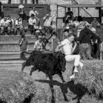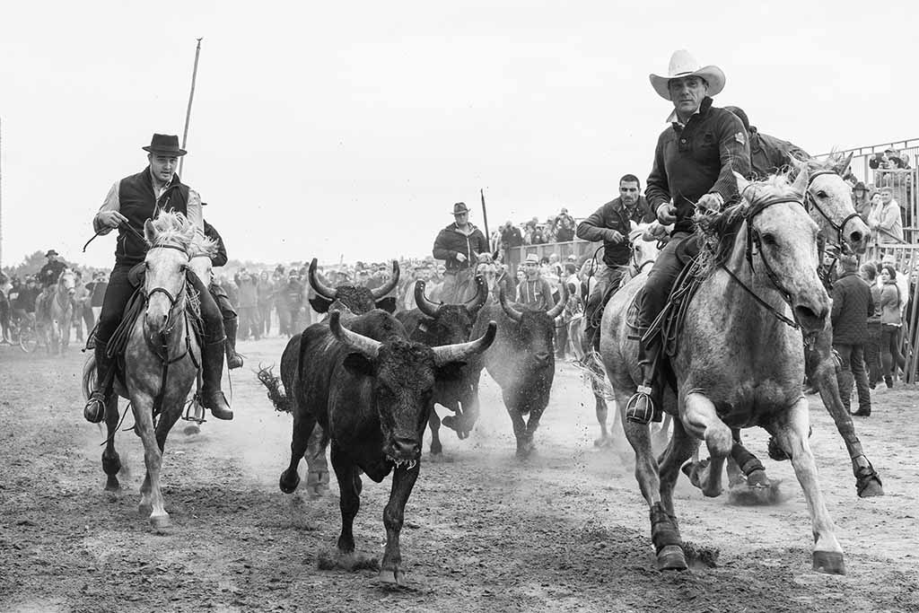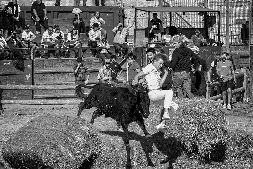 In the morning we capture the Abrivado, as they arrive for the day’s festivities. Again, the Gardians flank the bulls and they arrive at a gallop, clattering through the cobbled streets. Each farm (Mas) displays their skills with the bulls, herded by Gardians on horseback. Young lads attempt to get the better of the young bulls by distracting the horses –called the ‘Vachette’.