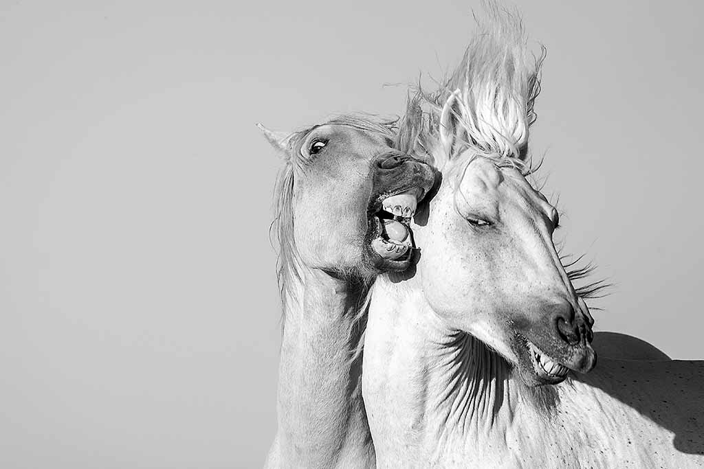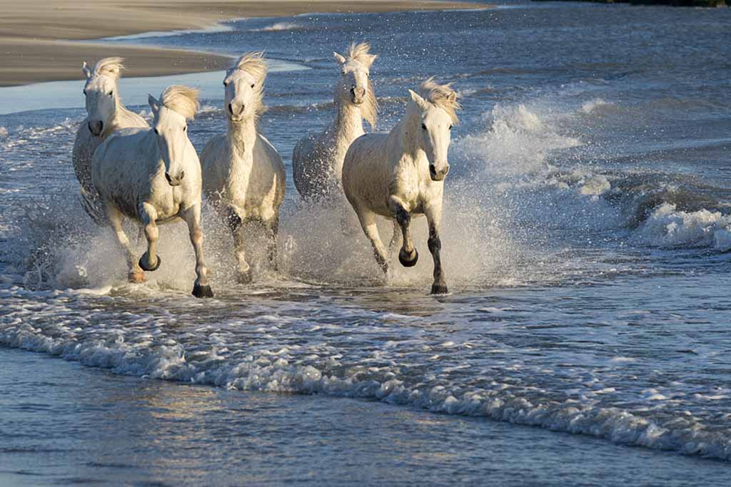 At dawn, we photograph the sparring stallions – this is a unique opportunity to see the wild white horses entwined at full height, in feisty temperament with their manes flying.