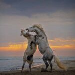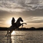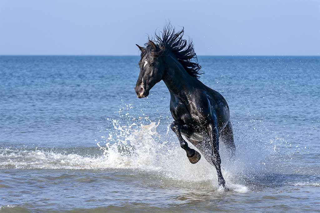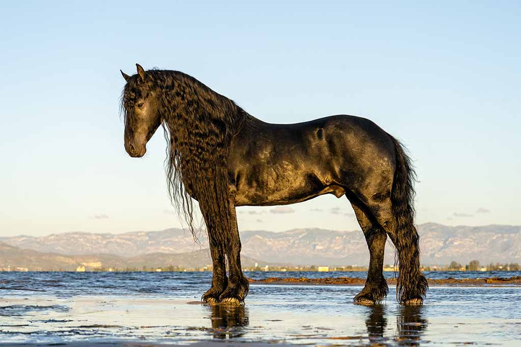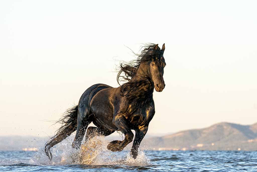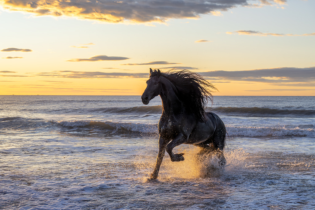 At sunrise, we head to the beach, with two Friesian stallions. We capture beautiful silhouettes as the sun starts to rise over the beach and sea. We then change location to photograph the stallions, with the warm winter sun transforming their coats to a shimmering gold, in the soft morning light. Poised and still or dashing through the shallow water of the lagoon, capture exciting action shots and stunning portraits.