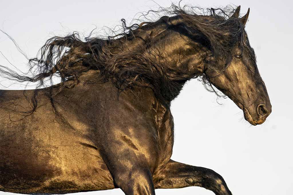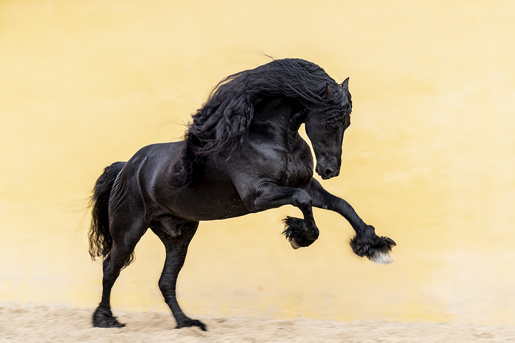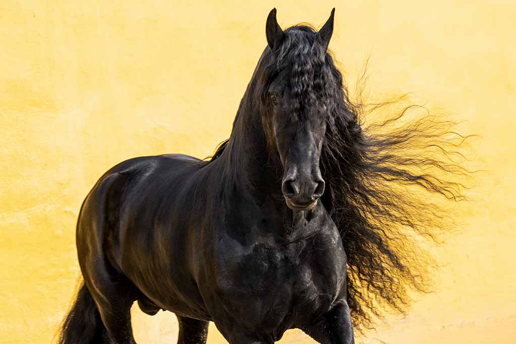 In the afternoon, we return to the ranch to photograph the majestic and feisty Friesian stallions, each one more beautiful than the last with their silky black coats and flowing manes, against a contrasting-coloured wall.