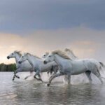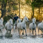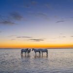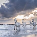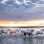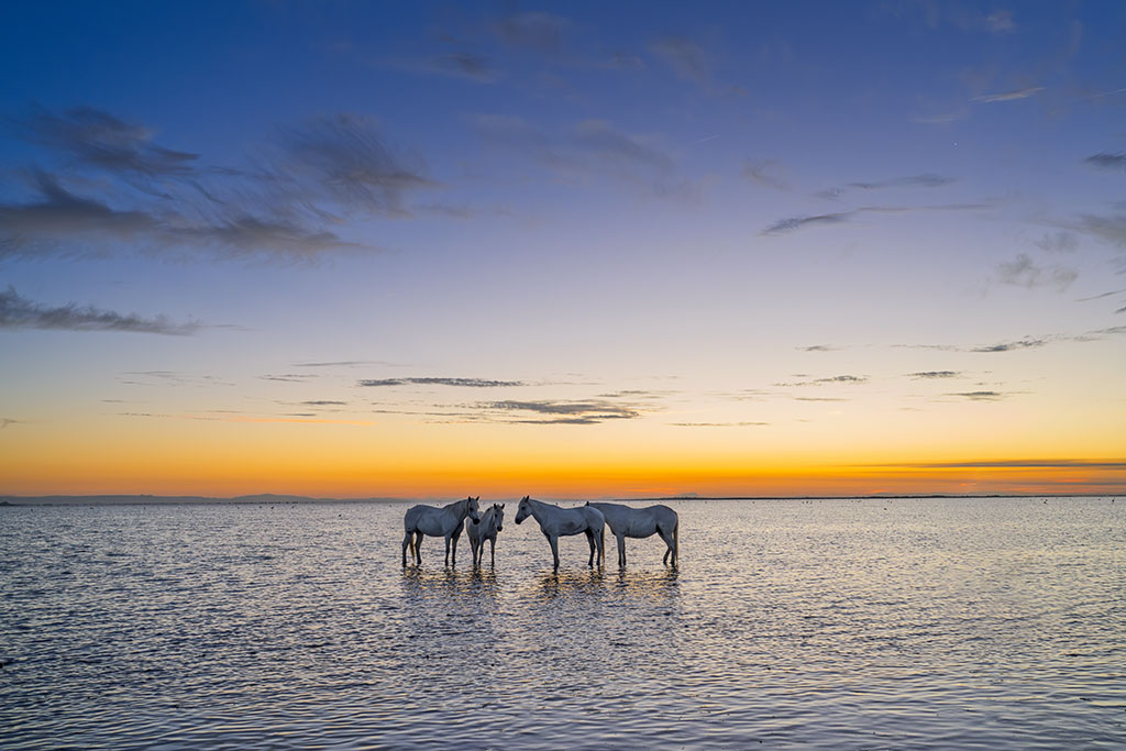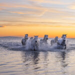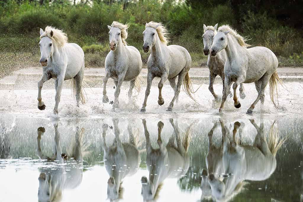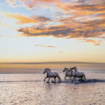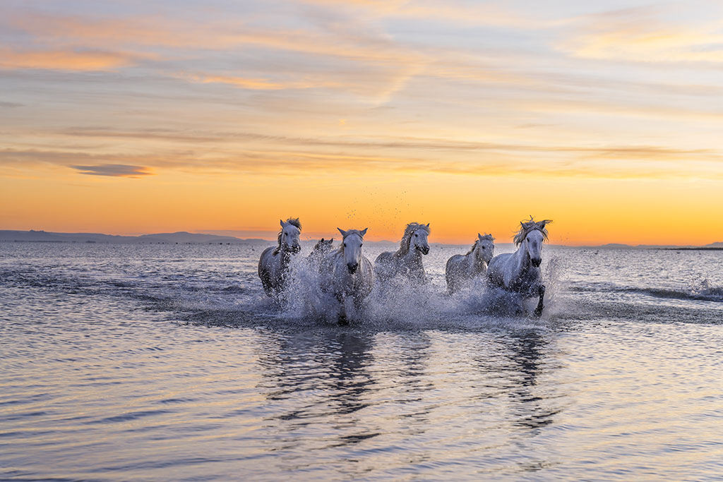 At sunrise, we photograph the Camargue wild white horses at a peaceful lagoon with beautiful reflections. We then head for the beach to capture the horses running along the golden sand and in the sea and surf.