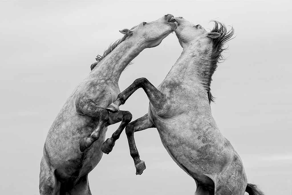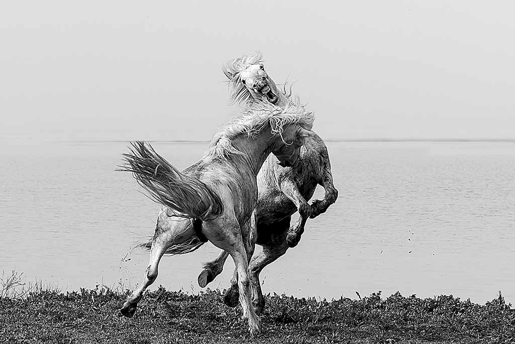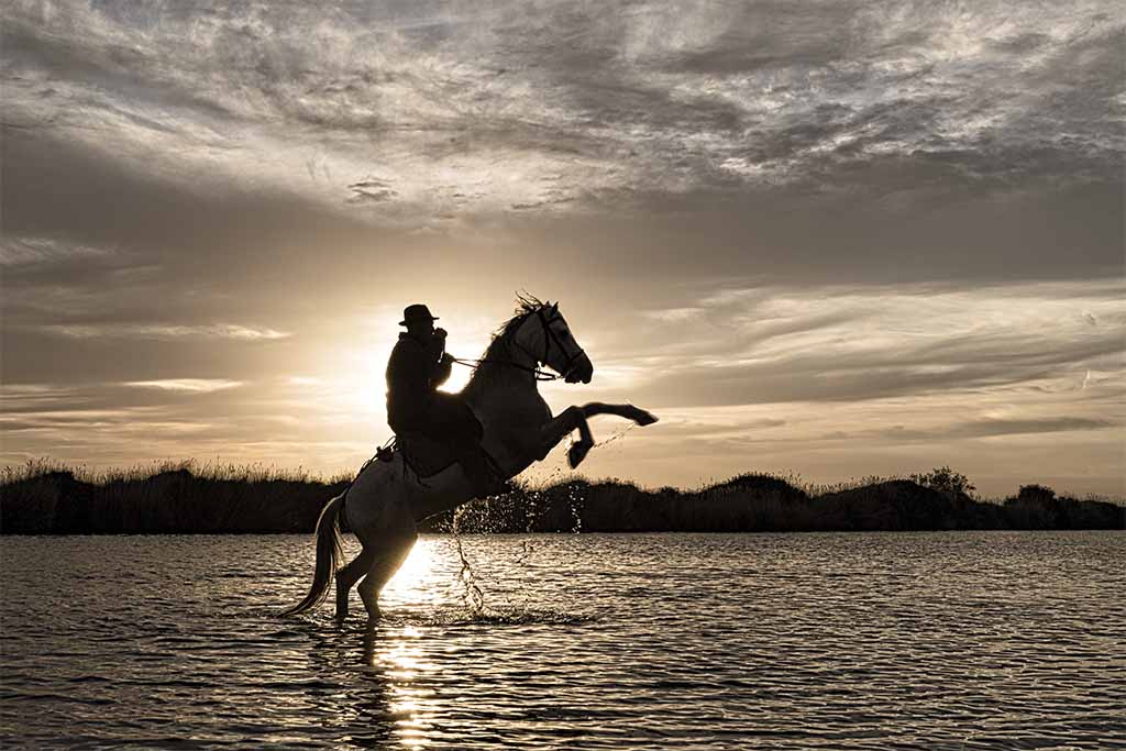 In the afternoon, we photograph the sparring stallions – this is a unique opportunity to see the Camargue white horses entwined at full height, in feisty temperament, with their manes flying.