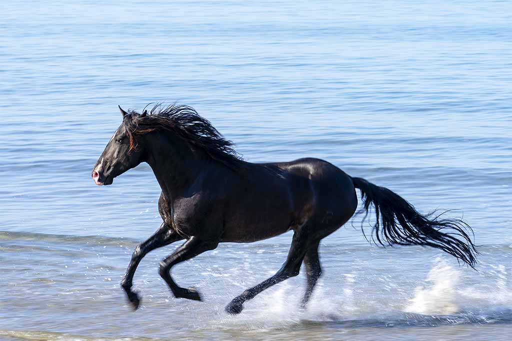 In the morning, we photograph a beautiful black trained Andalusian stallion who loves the beach! We capture him running along the beach and frolicking in and out of the sea and surf providing a wide range of dramatic images.