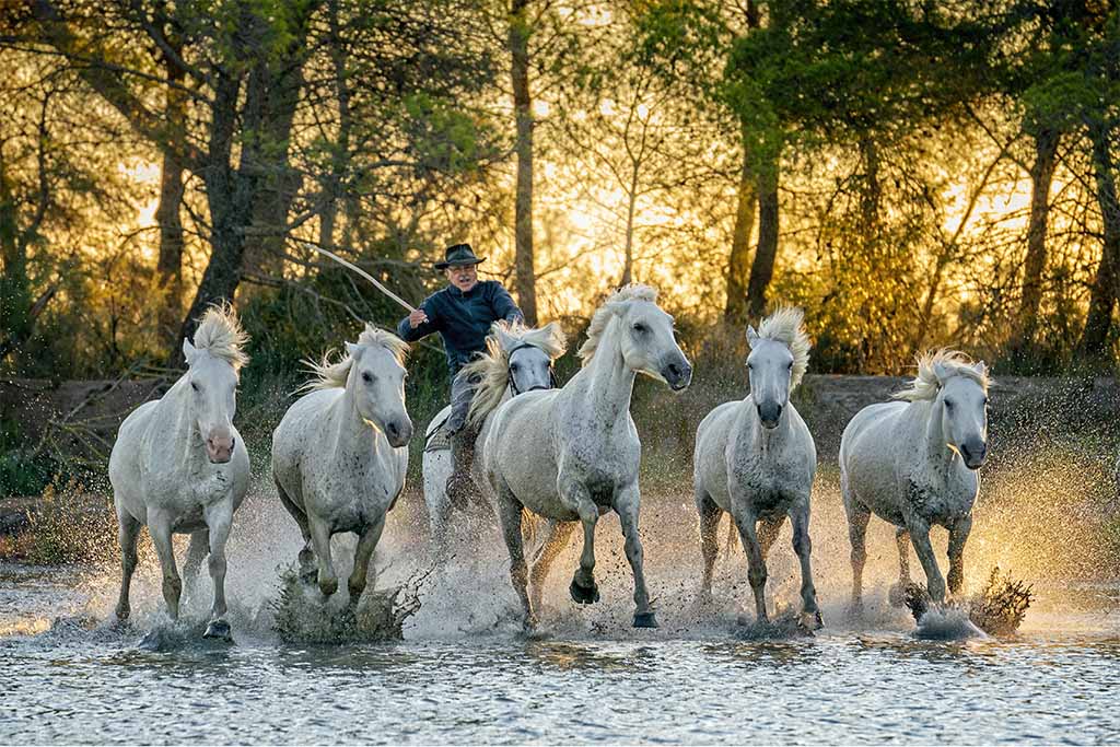Early morning, we have another session with the Camargue wild white horses in the marsh. We also capture the horses, beautifully backlit, by the sunrise, as they run through the woods. After the action, we take close-up portraits of the horses.