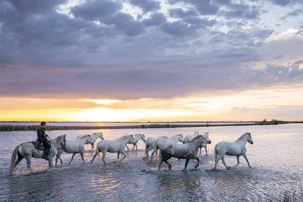 Late afternoon, we photograph the Camargue wild white horses running through the marsh. We shoot several drives with the horses running across and towards your field of view. We will also take portraits of the ‘Gardians’ (Camargue Cowboys) dressed in their traditional Camargue attire, trident in hand, surrounded by the herd.